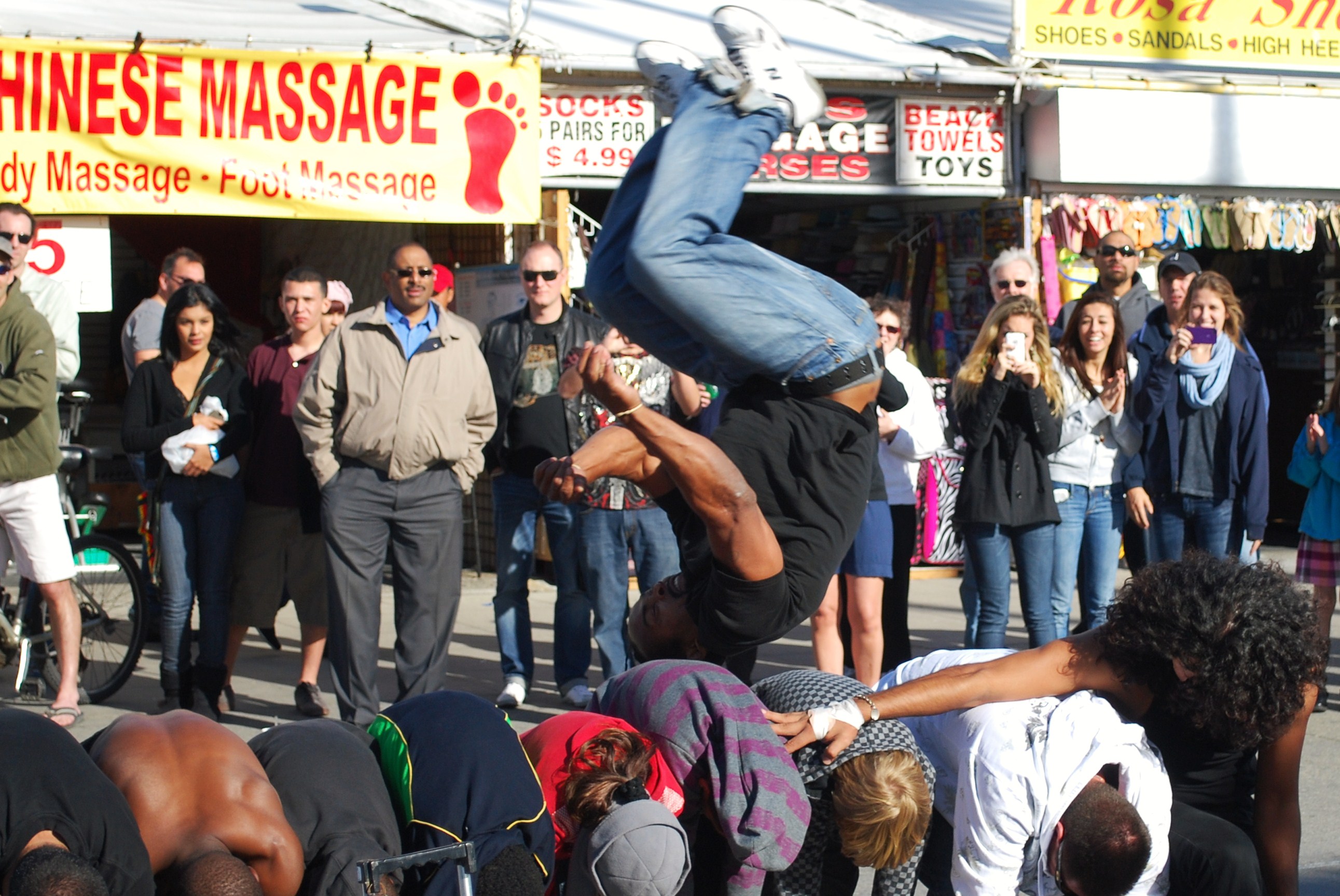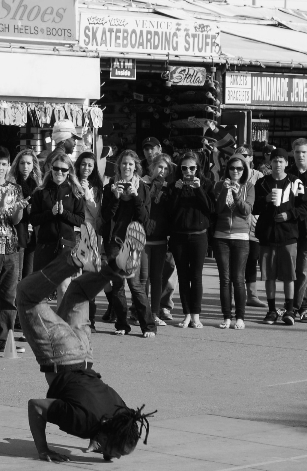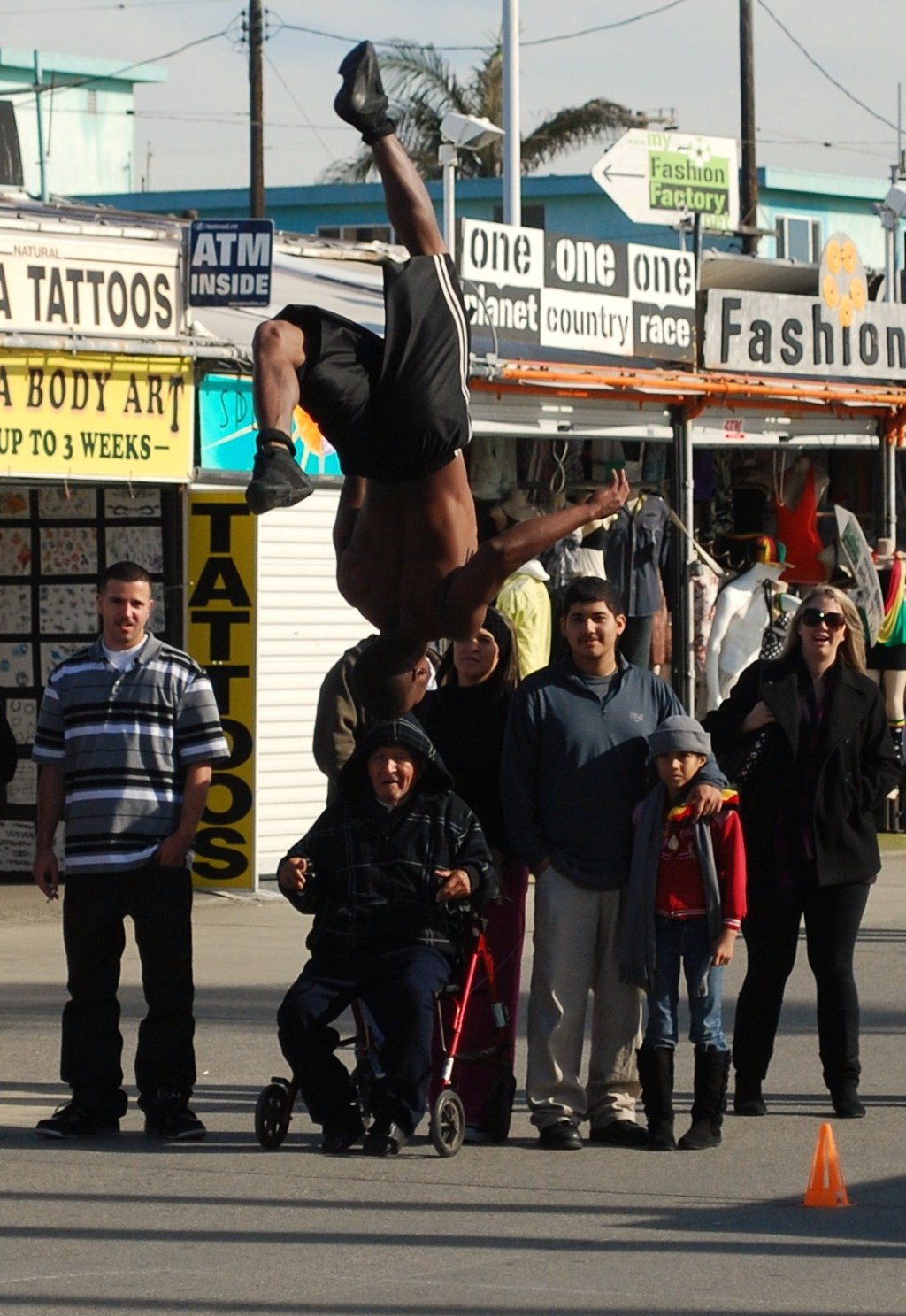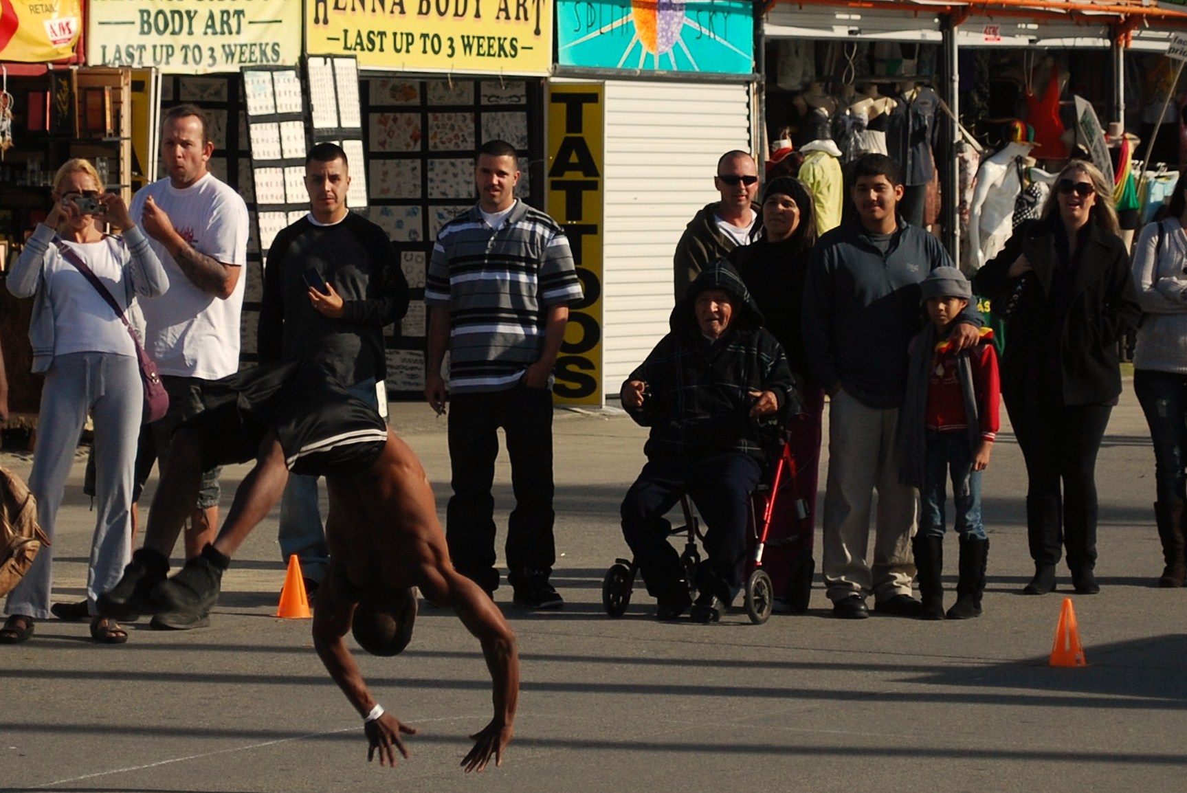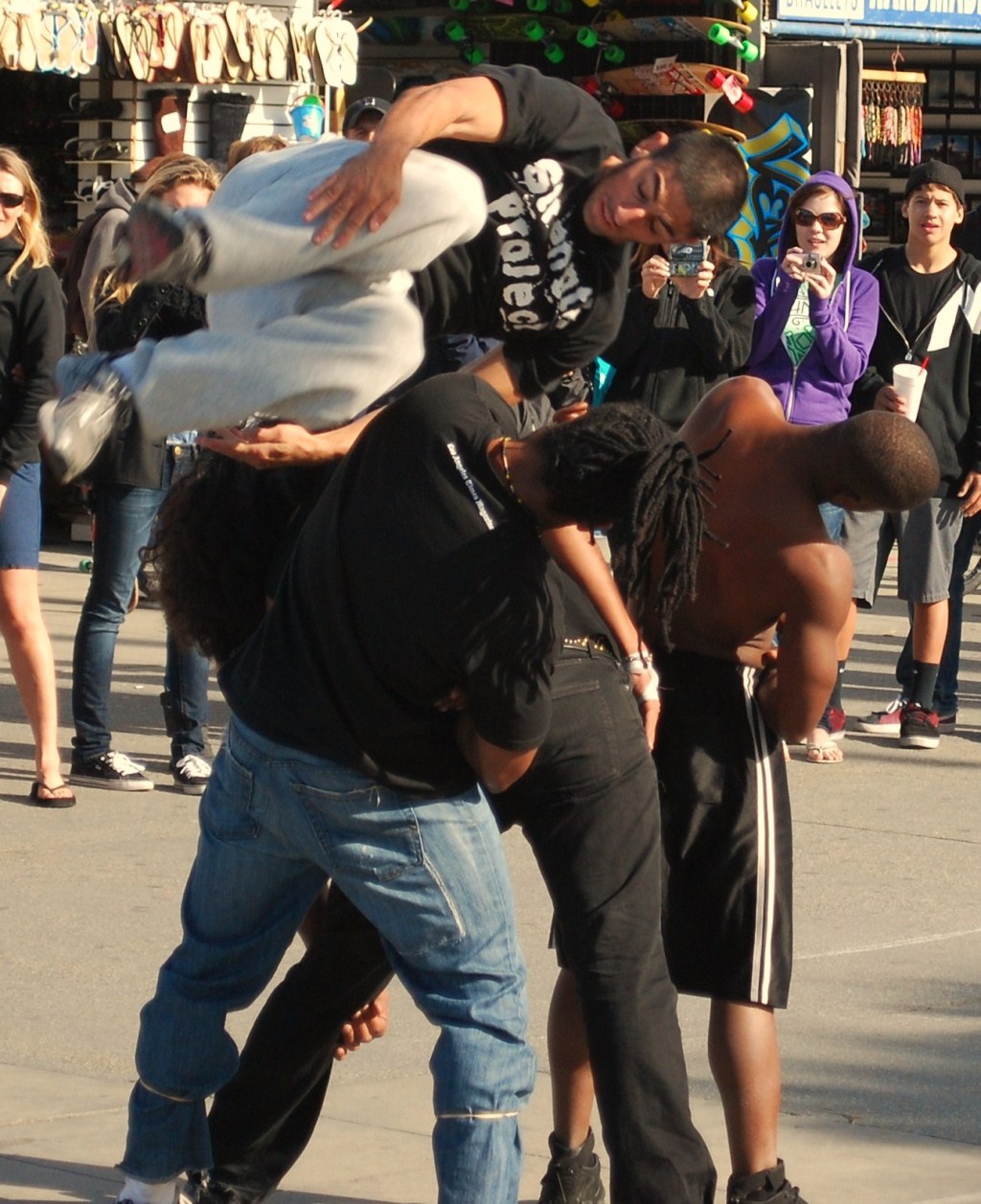 When I was in California, my favorite place by far was Venice Beach. There were a few too many druggie scumbags but that’s to be expected when people flock there from all over the country expecting hippie Shangri-la. The best experience I had there was one random afternoon when I went there just for lunch but chanced upon a really good crew doing some ridiculous routines on the boardwalk.